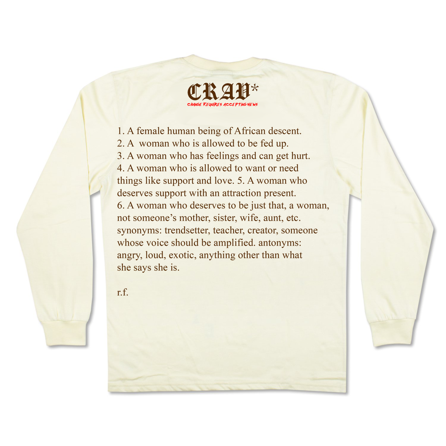 CRAV* SHOP Categories: All TOPS BOTTOMS OUTERWEAR ACCESSORIES SETS All TOPS BOTTOMS OUTERWEAR ACCESSORIES SETS "Ancestry" Bomber Jacket REVOLUTION* TEE "CROSS*" FLARED SWEATPANTS "CALL IT WHAT IT IS" DOUBLE LAYER HOODIE "BUTTERFLY EFFECT" Flared Jeans "Evil Eye" Mohair Sweater SOLD OUT* CRAV* Industries x The One Not Seen "REVOLUTION" Tapestry Cardigan SOLD OUT* "Butterfly Effect*" Mesh Shorts SOLD OUT* "FIGHT FOR OUR ANCESTORS" Oversized Tee SOLD OUT* "BURNING DESIRES" Oversized Long Tee SOLD OUT* "TIR:ED" Oversized Hoodie SOLD OUT* "TIR:ED" Sweatpants SOLD OUT* "HANDS TOWARDS CHANGE" DICKIES JACKET SOLD OUT* CRAV* x Words By Rei SOLD OUT* ITS OK TO LOVE* OVERSIZED TEE SOLD OUT* HEARTBEAT* TRUCKER SOLD OUT* PEACE FLOWER* TRUCKER SOLD OUT* TERRY* SHORTS SOLD OUT* CROSS* JOGGERS SOLD OUT*
